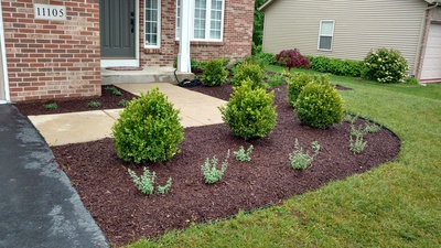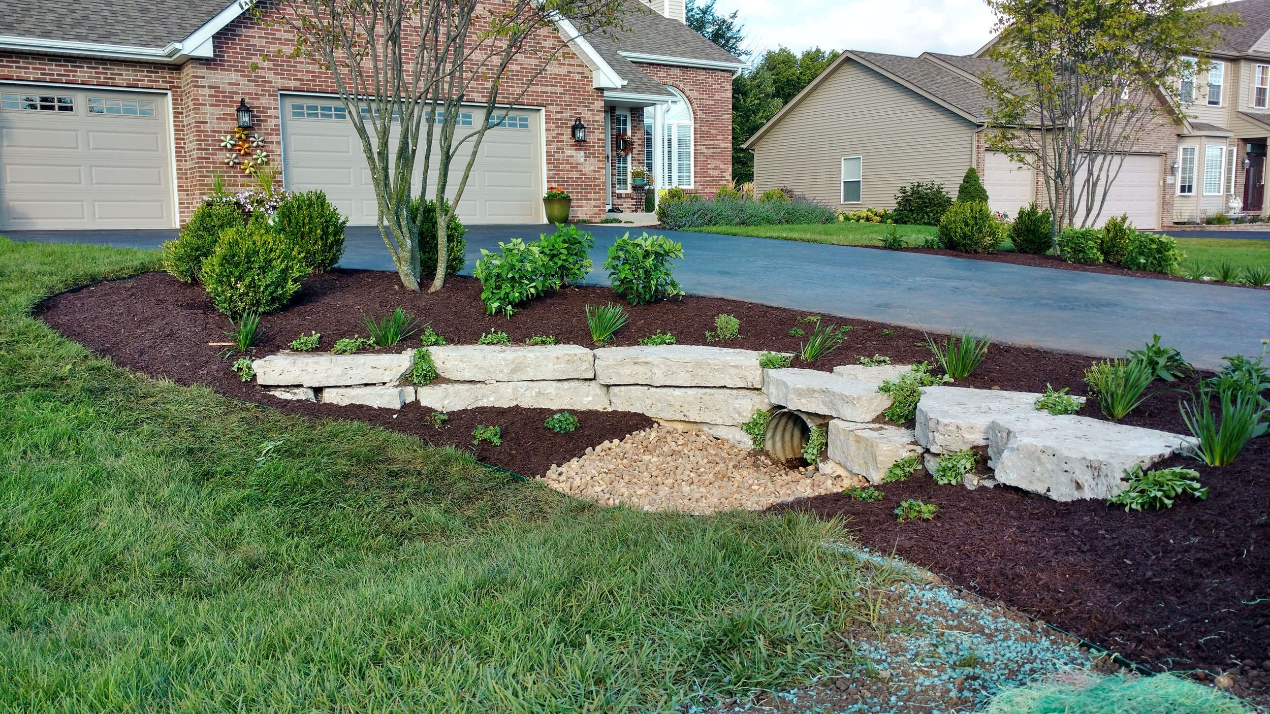 The end goal on this specific project was to spruce up an existing driveway. Our customer really wanted to do something unique that would make a statement but wouldn't overpower the surrounding landscape. The plantings in front of the house were also designed to facilitate the owner's need of being low maintenance while fulfilling the attributes of multi-seasonal color and texture. Our Designer included natural Fon du Lac Outcropping stones and decorative tan and brown Meramec gravel by the culvert to soften the overall driveway appearance. Double processed dark brown hardwood mulch was added to enhance the color of both plant material and natural stone really making this overall look pop with color!