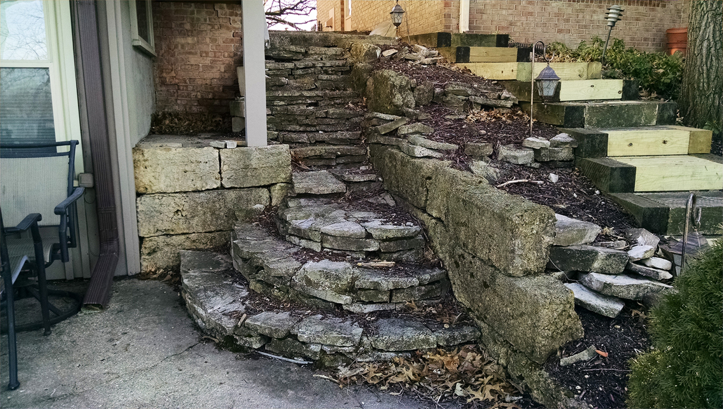 Our solution was to stabilize the deck with a temporary support beam, then continue to deconstruct and eliminate the old stones. The new steps were constructed using Unilock Ledgestone step units in Buff and complementary retaining walls were installed using Unilock Old Quarry wall stone in River. To maintain an even rise in height on each step, the overall stairway was expanded and ended perfectly at the end of the home's foundation. Now this owner has a comfortable and safe stairway to use while enjoying this beautiful backyard and the stunning scenery.