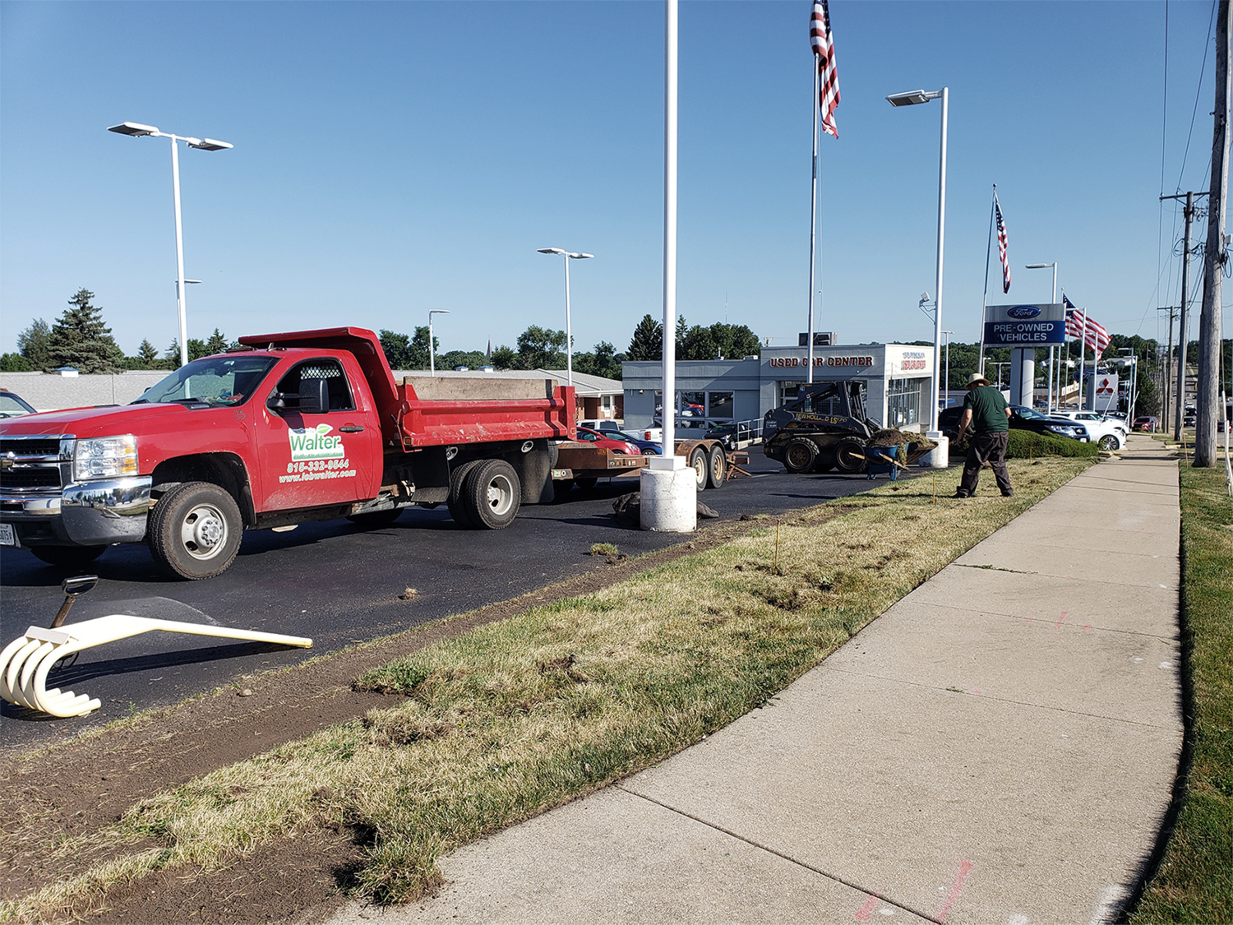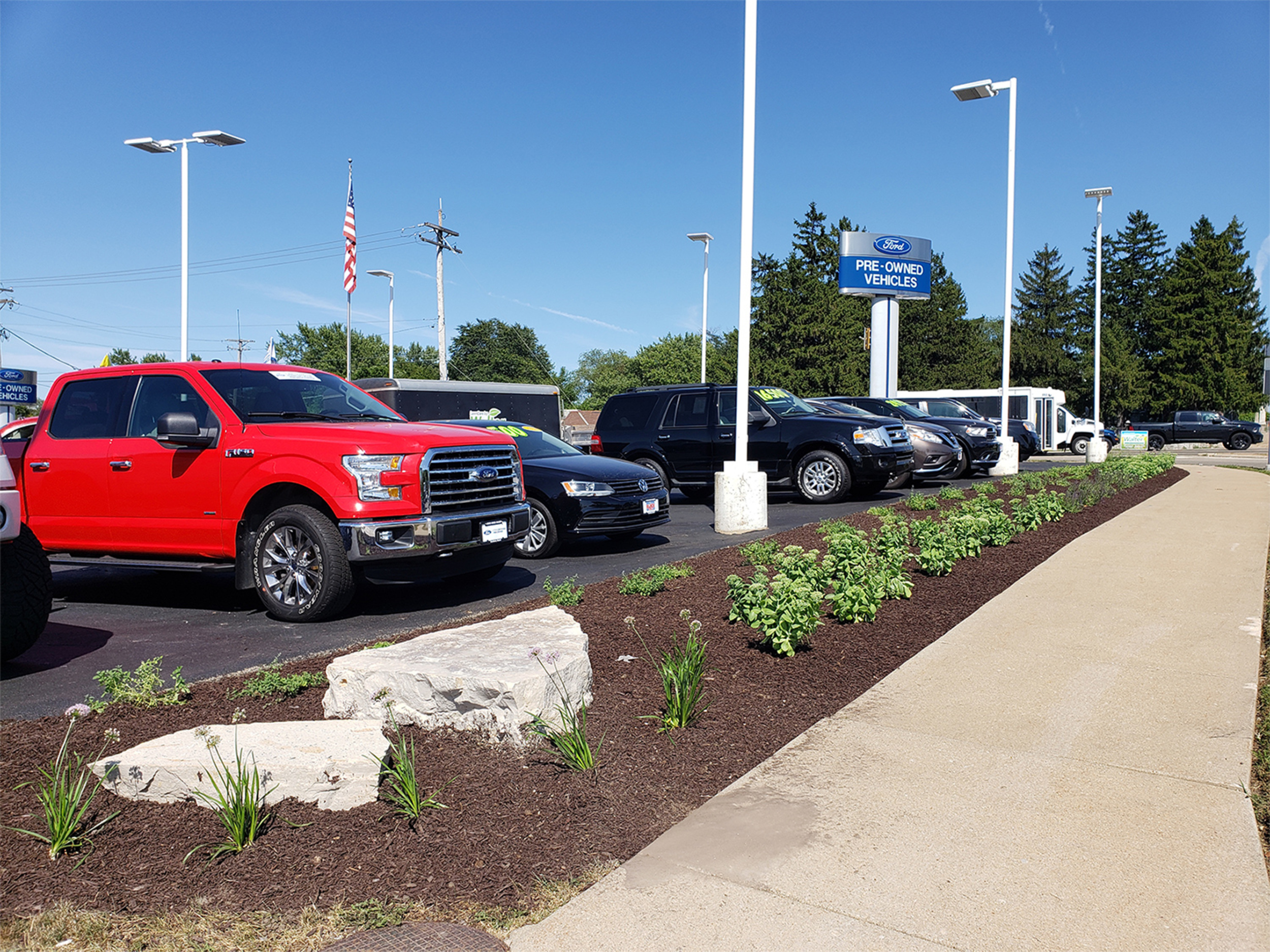 We partnered with Green Key Landscape Design and the Miracle Mile Rockford to complete the landscape overhaul of the Rock River Blocks frontage beds along the corner of Alpine Road and State Street. The unassuming turf and tired Juniper shrubs were replaced with a low-profile mix of hardy, salt tolerant, colorful perennials such as Catmint, Salvia, and Allium. Key locations were accented with beautiful specimen pieces of Fond du Lac outcropping stone. Once complete, this corner became a highlight to the local business area and enhanced the overall appeal of the properties.